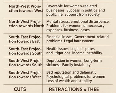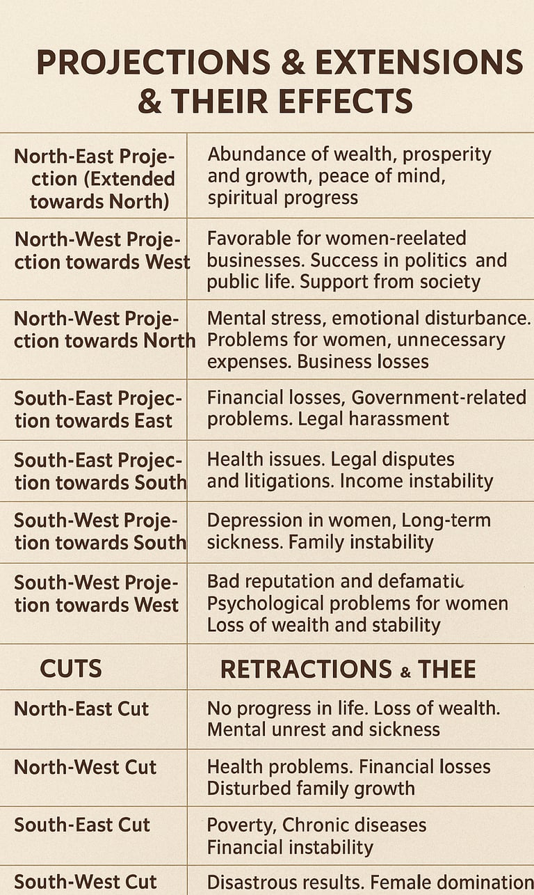 In Vastu Shastra, projection (extension) or cut (retraction) in any direction of a plot or house directly affects life areas such as health, wealth, relationships, and mental peace.